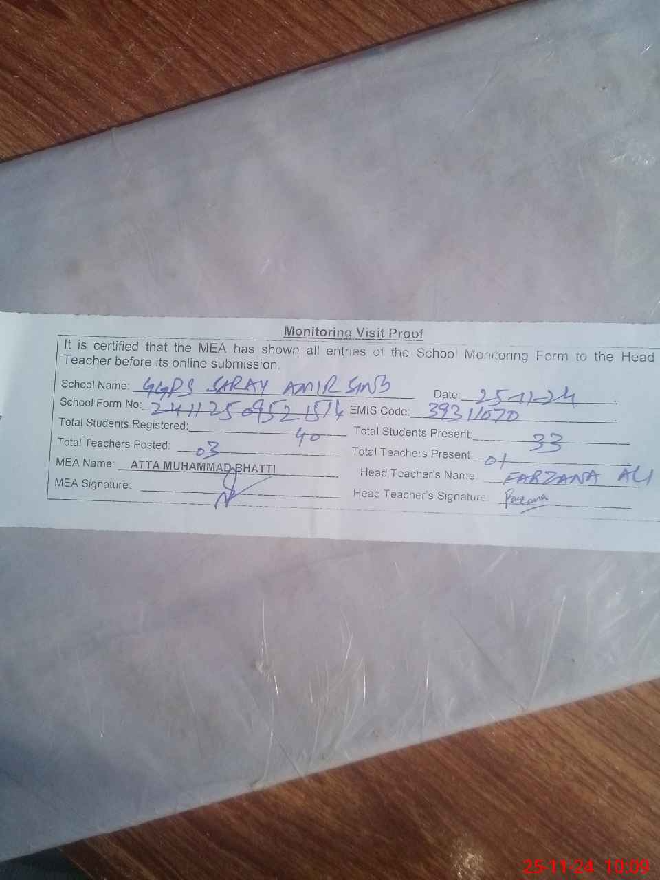 | Attendance Register | Head Teacher | MEA with School | Visit Proof |