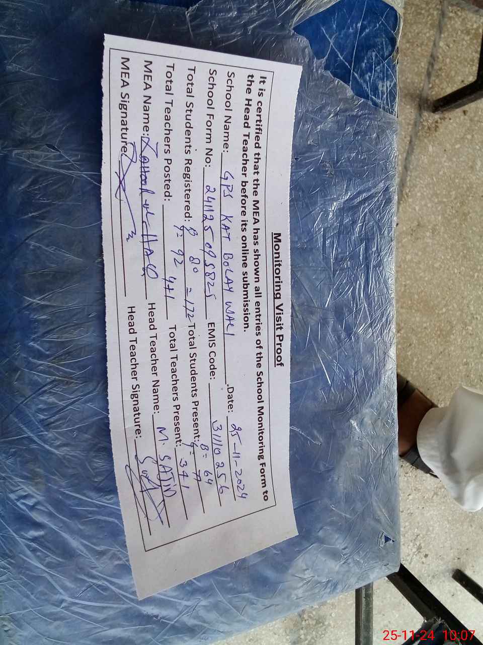 | Attendance Register | Head Teacher | MEA with School | Visit Proof |