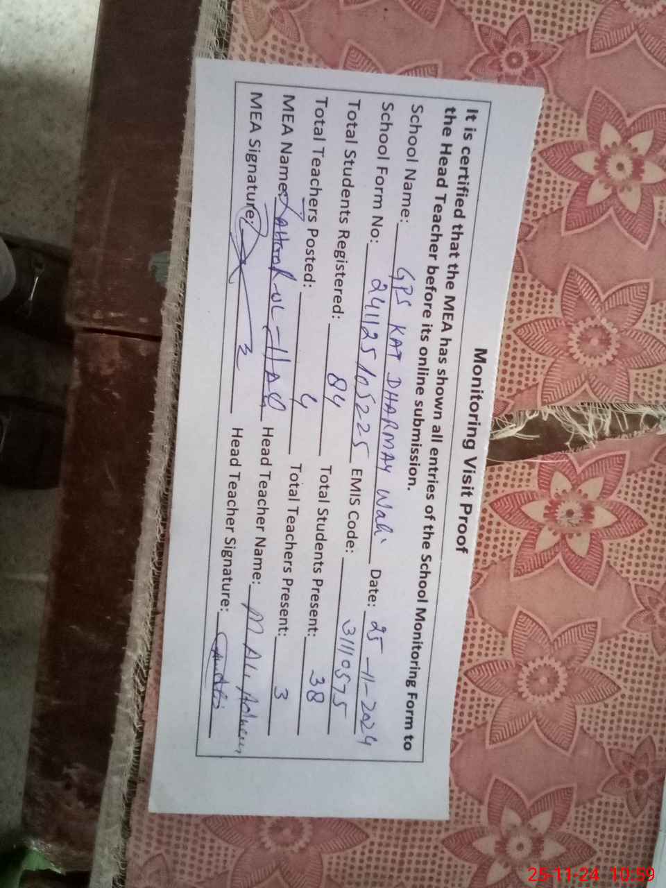 | Attendance Register | Head Teacher | MEA with School | Visit Proof |