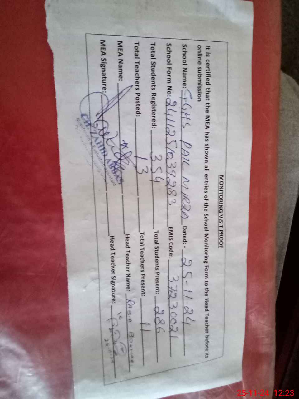 | Attendance Register | Head Teacher | MEA with School | Visit Proof |