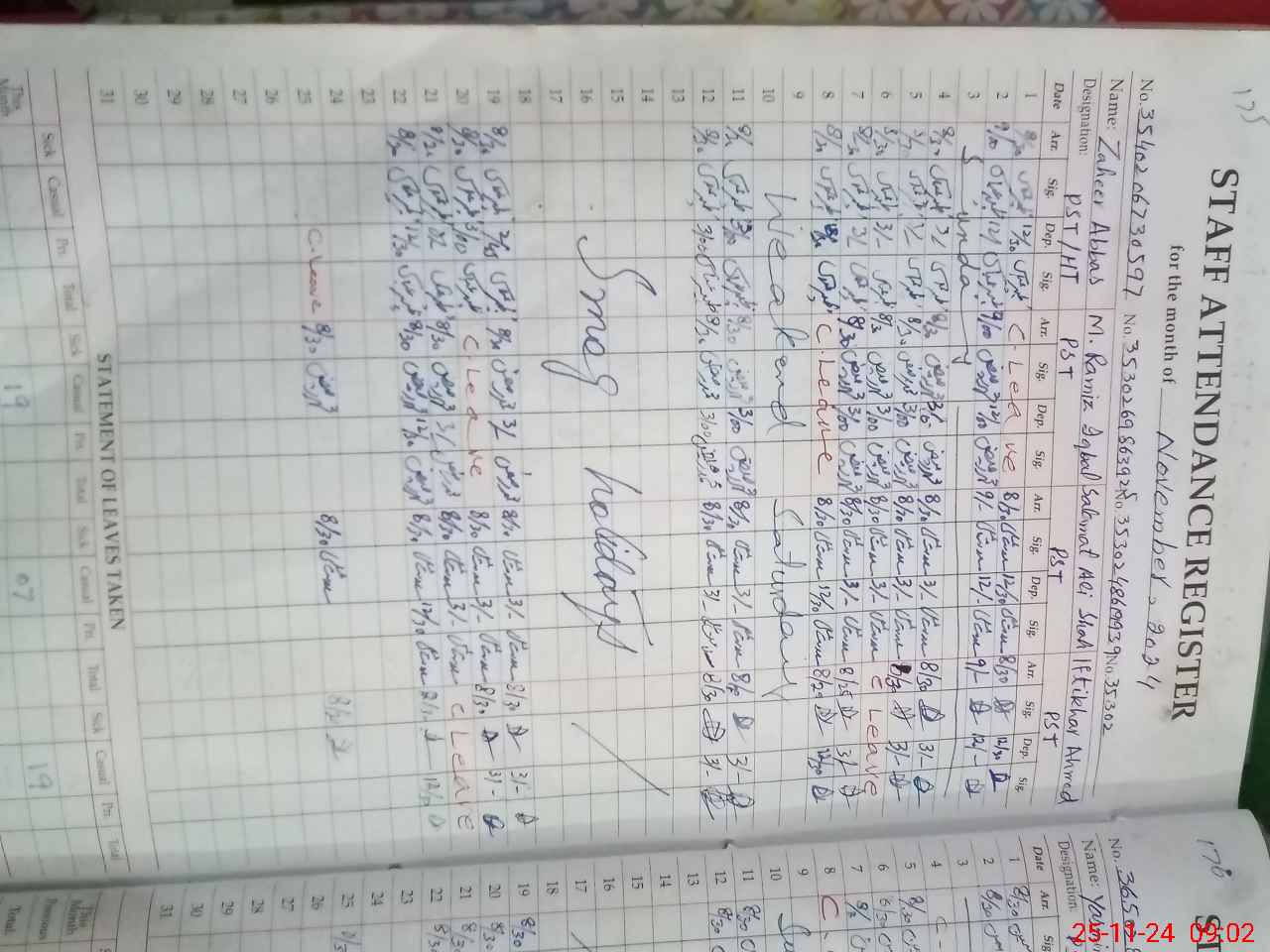 | CNIC | Full Name | Designation | R/C | Absence During Last Calender Month |