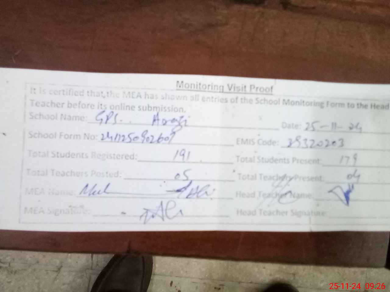 | Attendance Register | Head Teacher | MEA with School | Visit Proof |