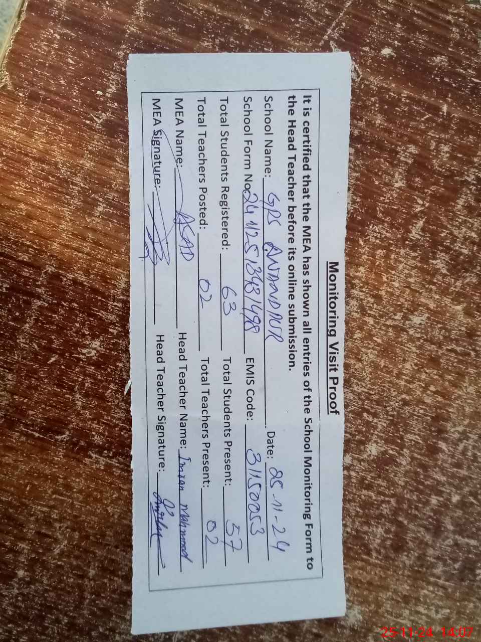 | Attendance Register | Head Teacher | MEA with School | Visit Proof |