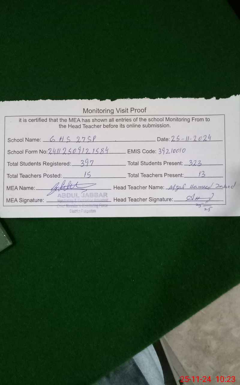 | EMIS Code: 39210010 | Name of School: GHS 27 SP | |||