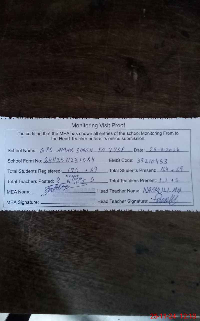 | EMIS Code: 39210453 | Name of School: GPS AMAR SINGH P/O 26/S.P PAKPATTAN | |||
