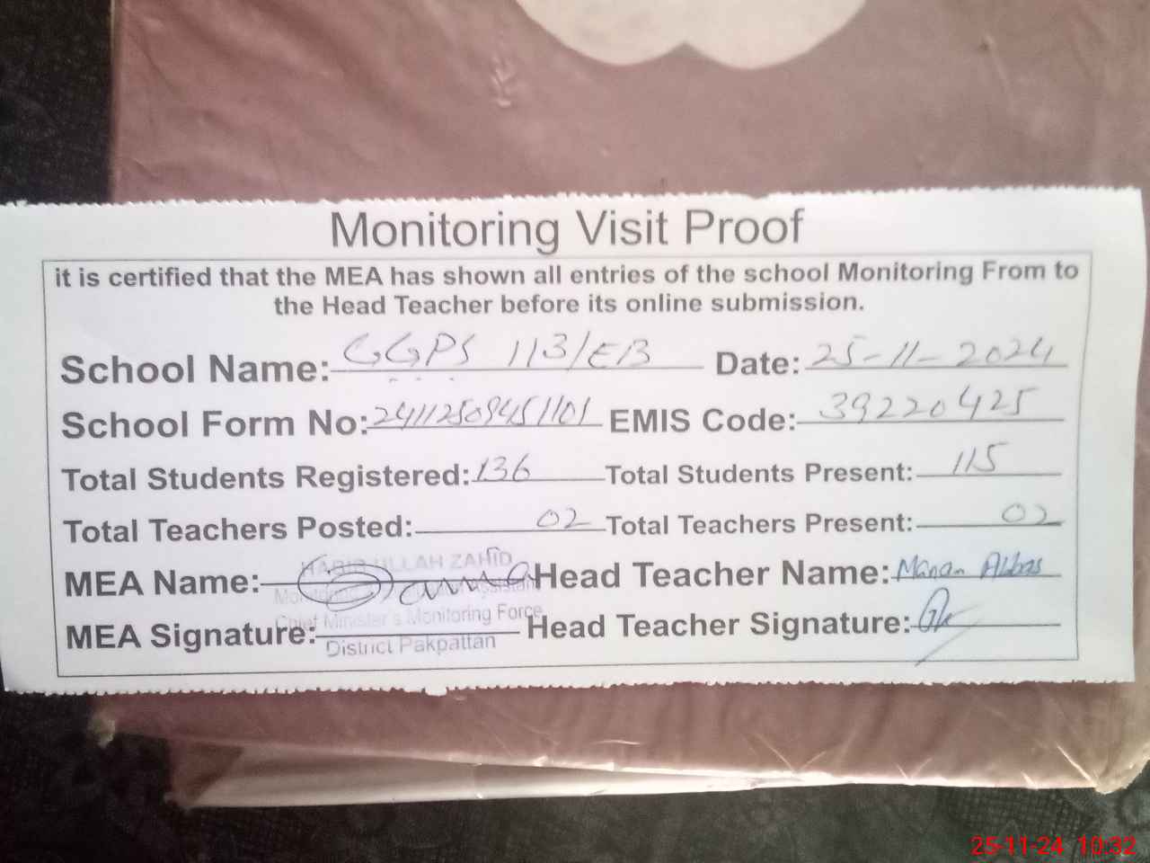 | EMIS Code: 39220425 | Name of School: GGPS 113 EB | |||