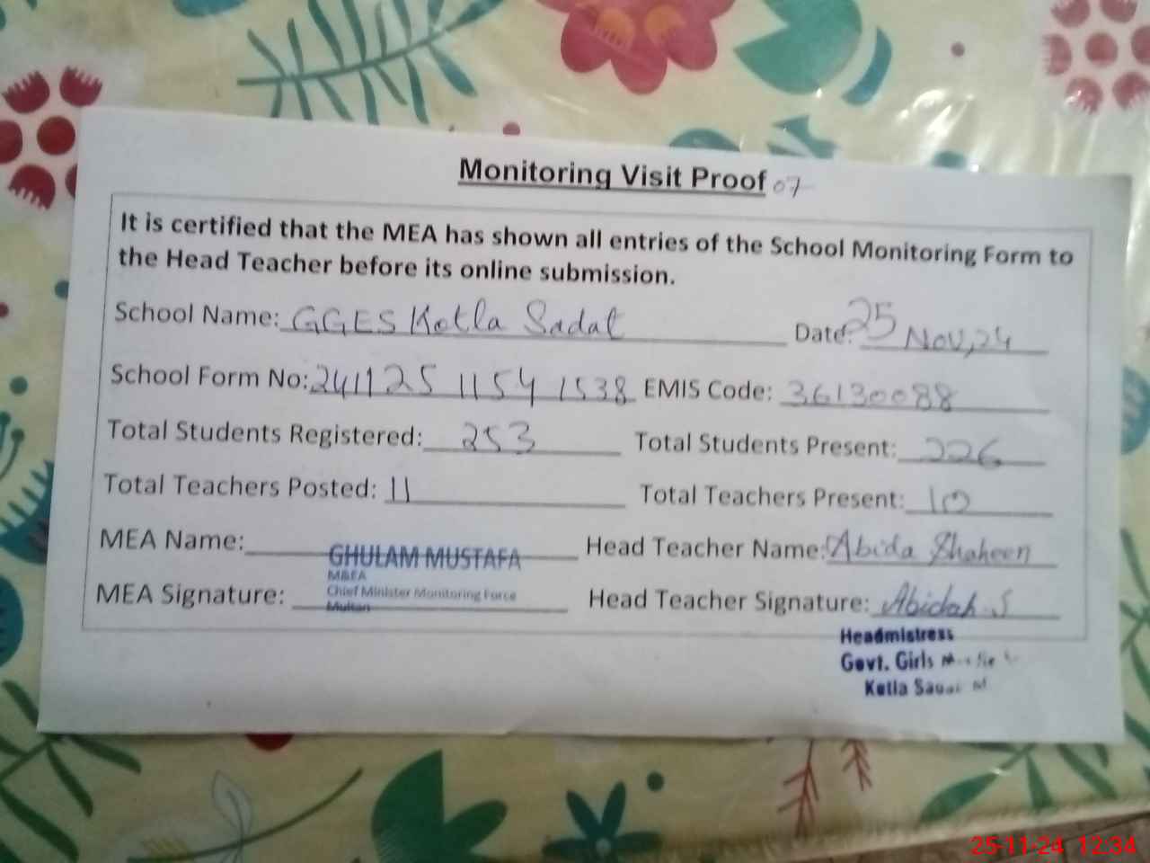 | Monitoring Date: 25-11-2024 | Start Time: 25-11-2024 11:54 AM | End Time: 25-11-2024 12:37 PM | Name of MEA: Gh**** Mu**** | |