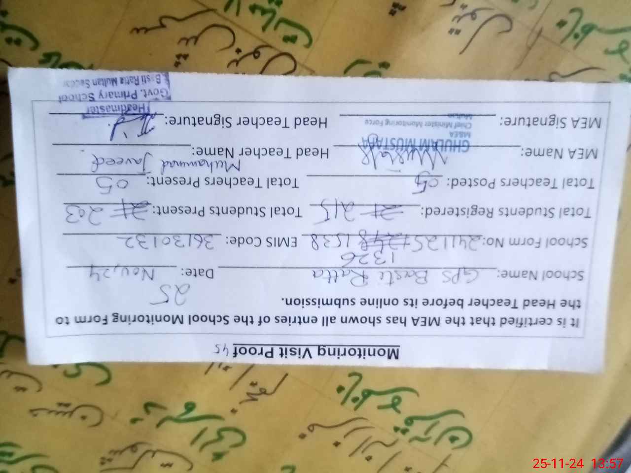 | Attendance Register | Head Teacher | MEA with School | Visit Proof |
