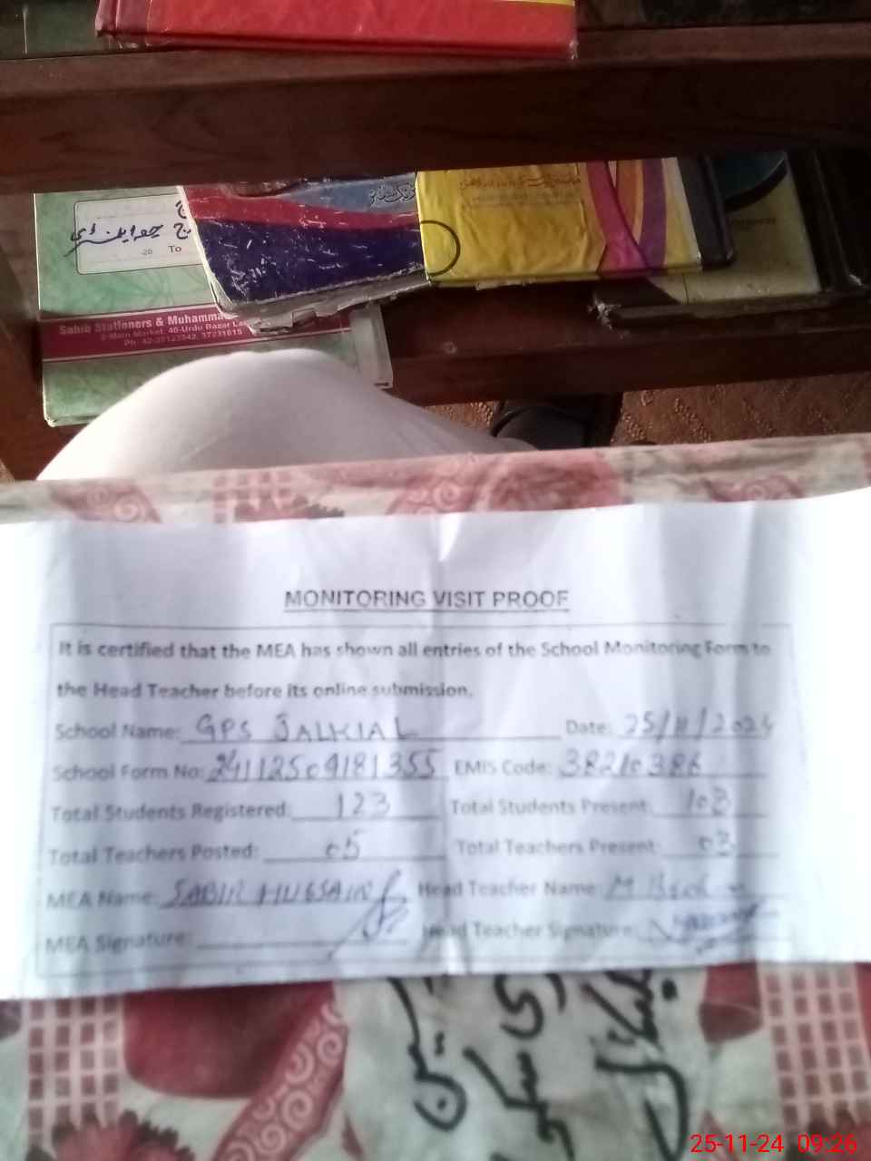 | Attendance Register | Head Teacher | MEA with School | Visit Proof |