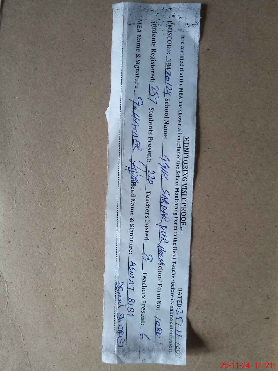 | Attendance Register | Head Teacher | MEA with School | Visit Proof |