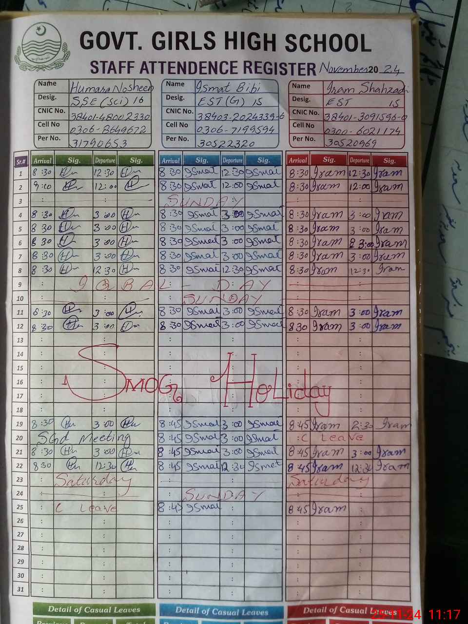 | CNIC | Full Name | Designation | R/C | Absence During Last Calender Month |