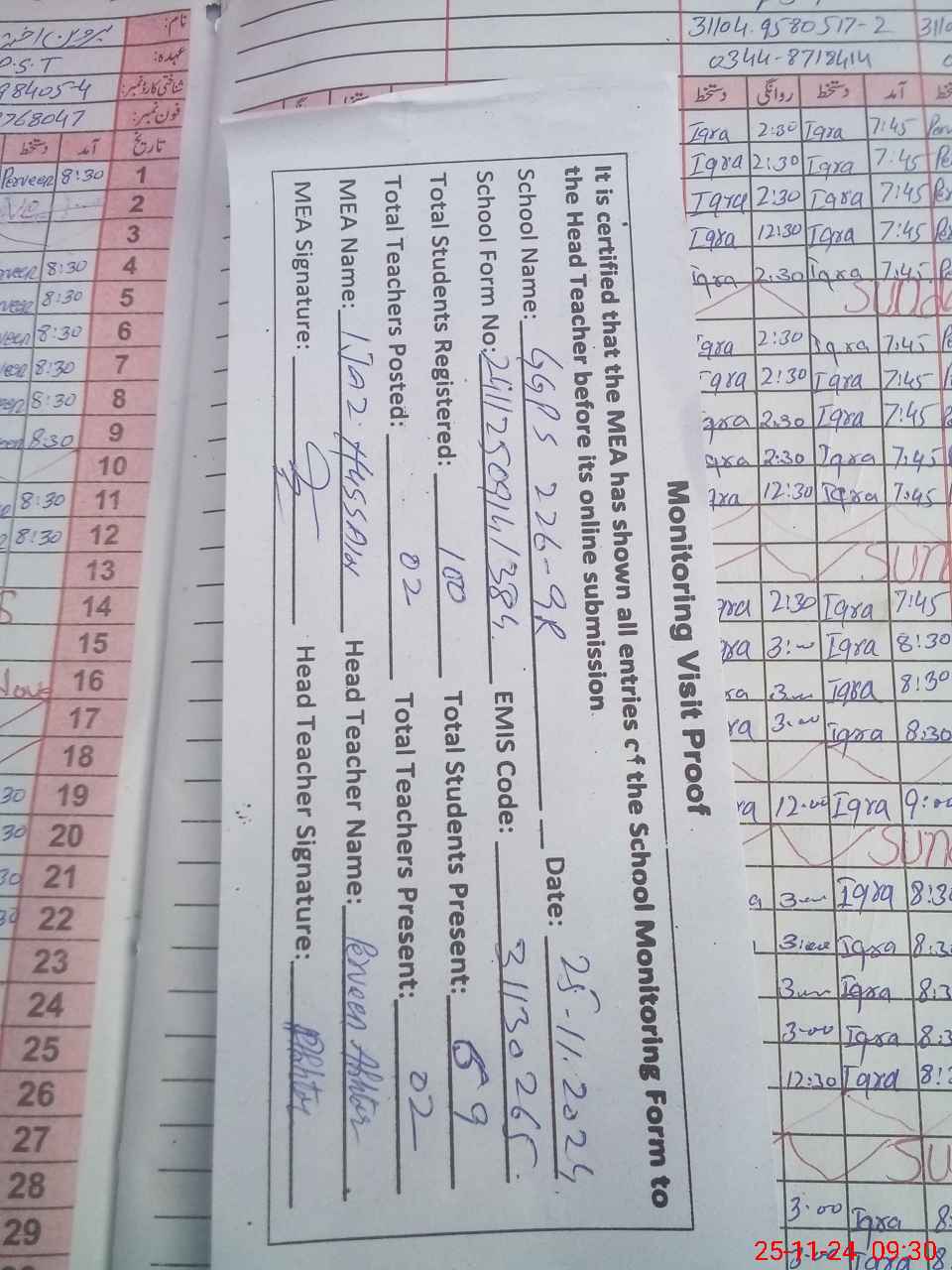 | Attendance Register | Head Teacher | MEA with School | Visit Proof |