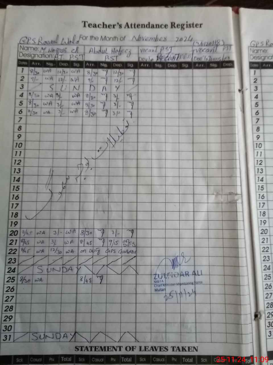 | CNIC | Full Name | Designation | R/C | Absence During Last Calender Month |