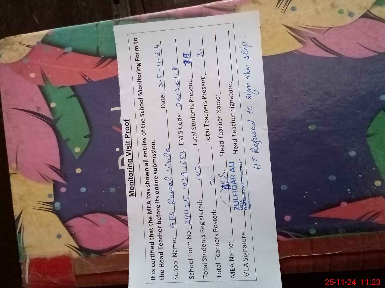 | Attendance Register | Head Teacher | MEA with School | Visit Proof |