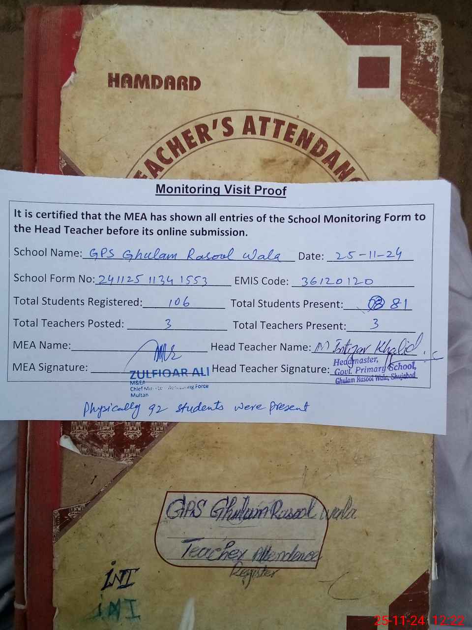 | Attendance Register | Head Teacher | MEA with School | Visit Proof |
