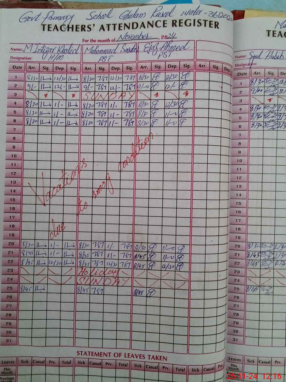 | Leave | Duty | Absent | Maternity | Medical | Ex- Pak |