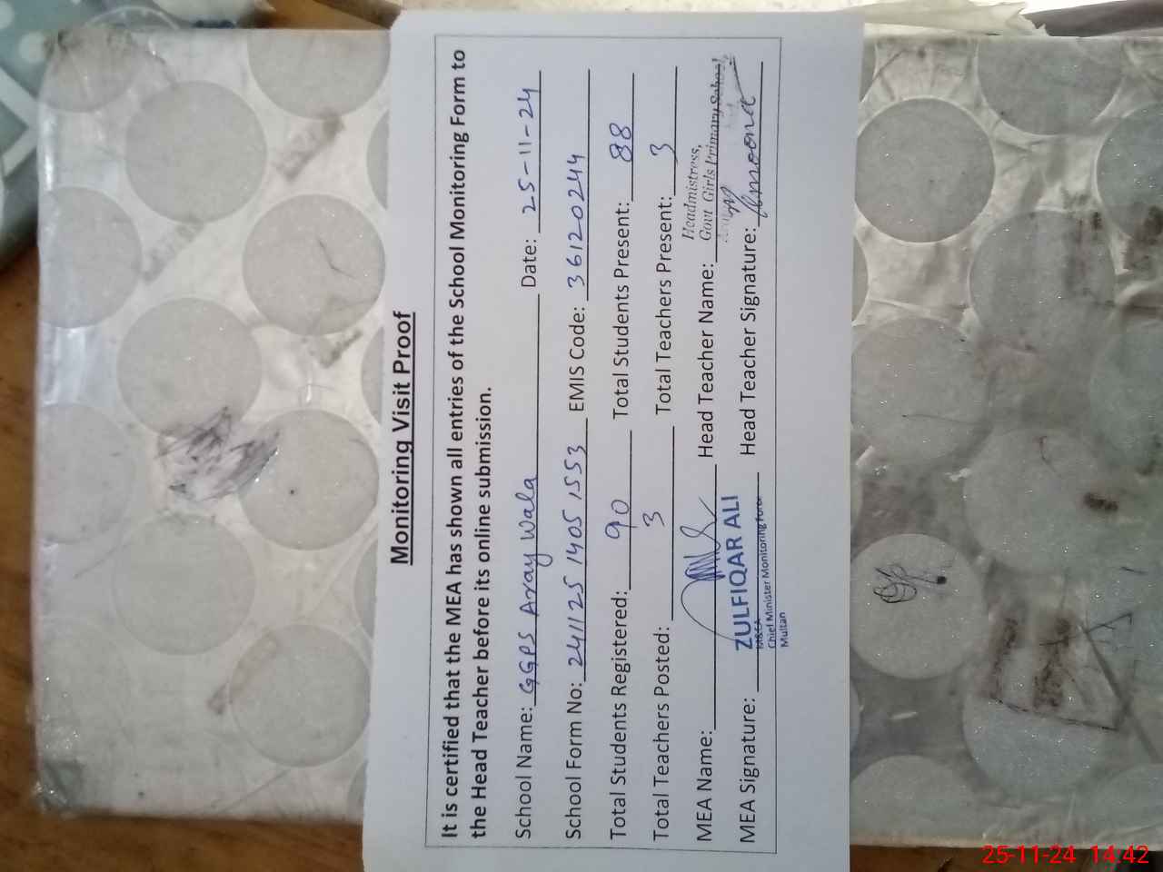 | Attendance Register | Head Teacher | MEA with School | Visit Proof |