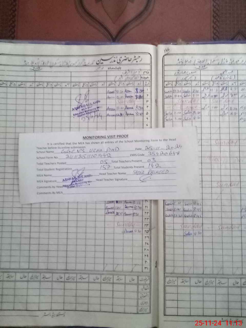 | Attendance Register | Head Teacher | MEA with School | Visit Proof |