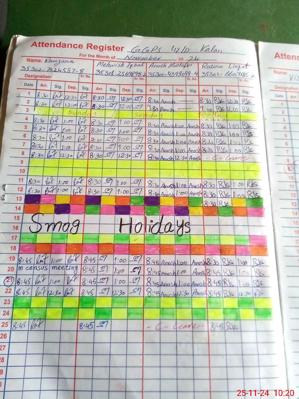| CNIC | Full Name | Designation | R/C | Absence During Last Calender Month |
