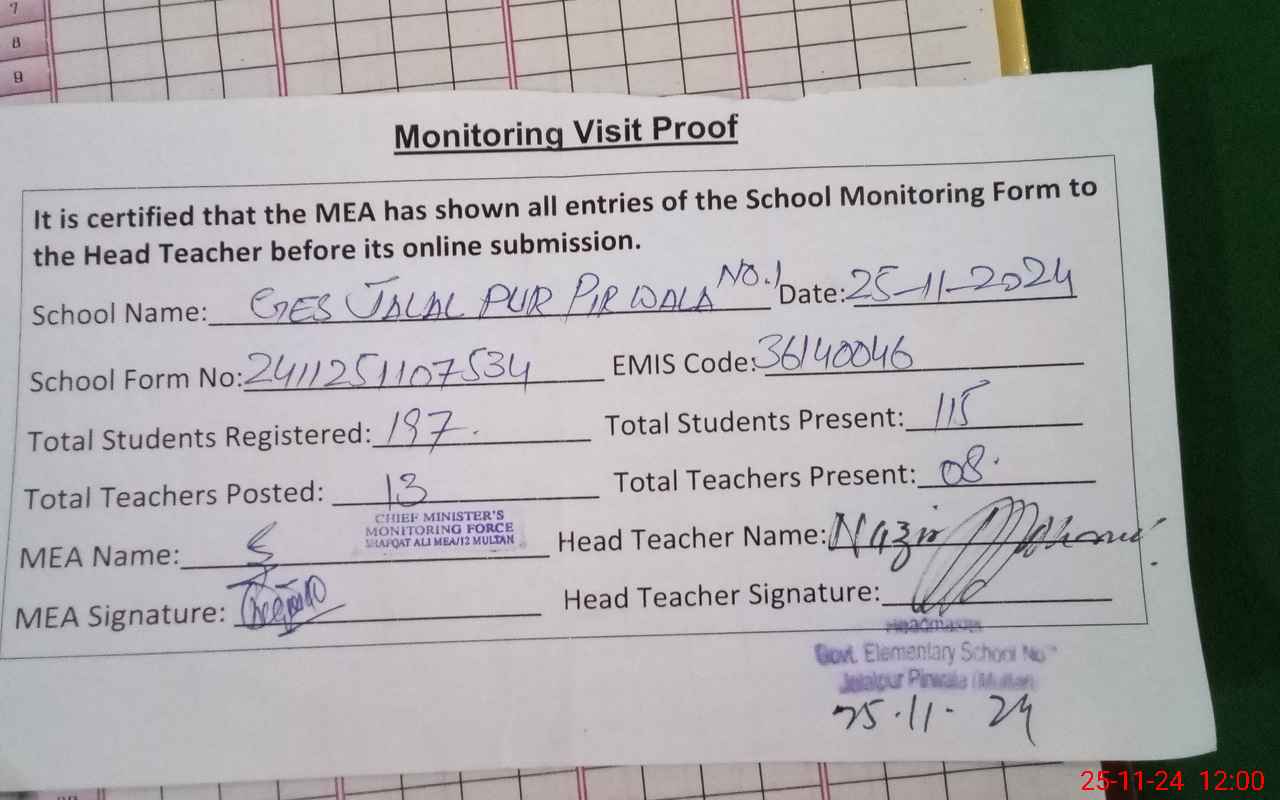 | Attendance Register | Head Teacher | MEA with School | Visit Proof |