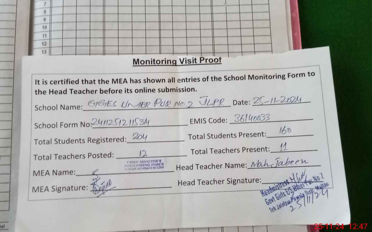 | Attendance Register | Head Teacher | MEA with School | Visit Proof |