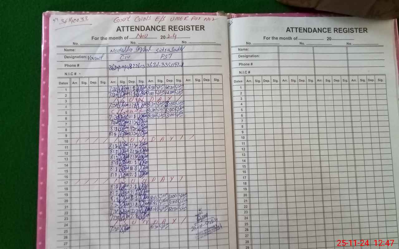 | CNIC | Full Name | Designation | R/C | Absence During Last Calender Month |
