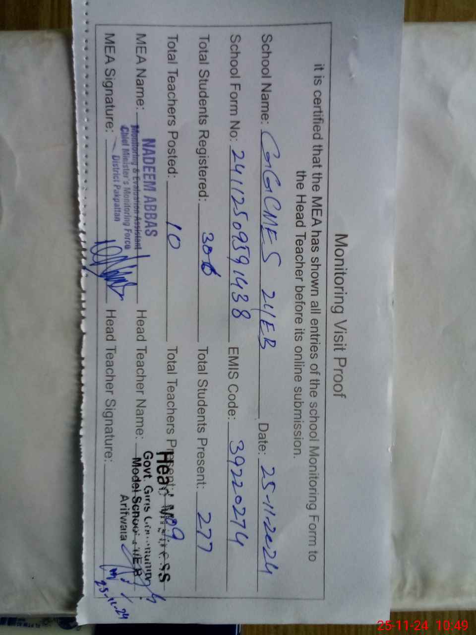 | Attendance Register | Head Teacher | MEA with School | Visit Proof |