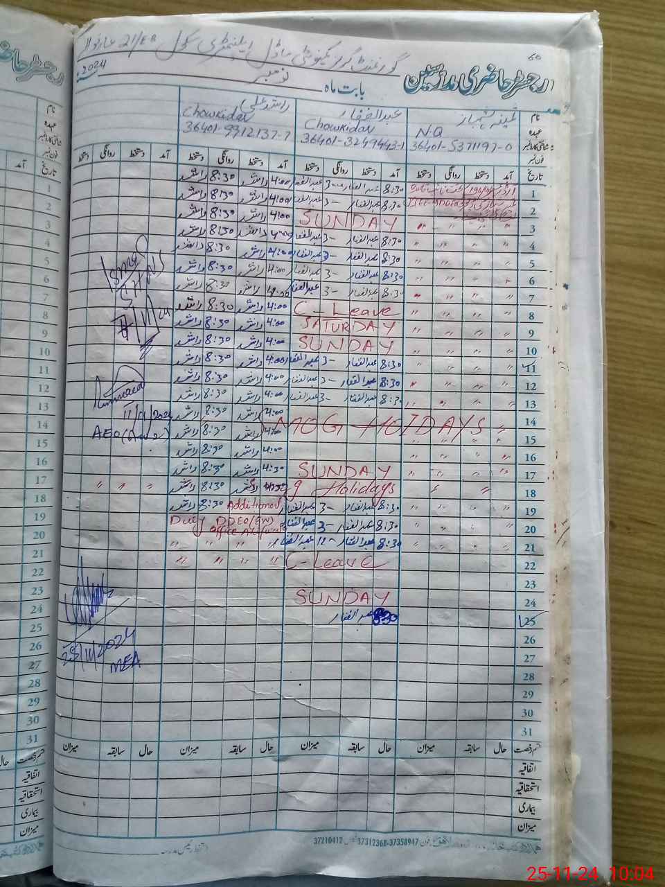 | 36**** | Ra**** Al**** | CHOWKIDAR | Contract | 5 | 0 | 0 | 0 | 0 | 0 | 0 | 0 | 5 | Absent (Un-Authorized) |