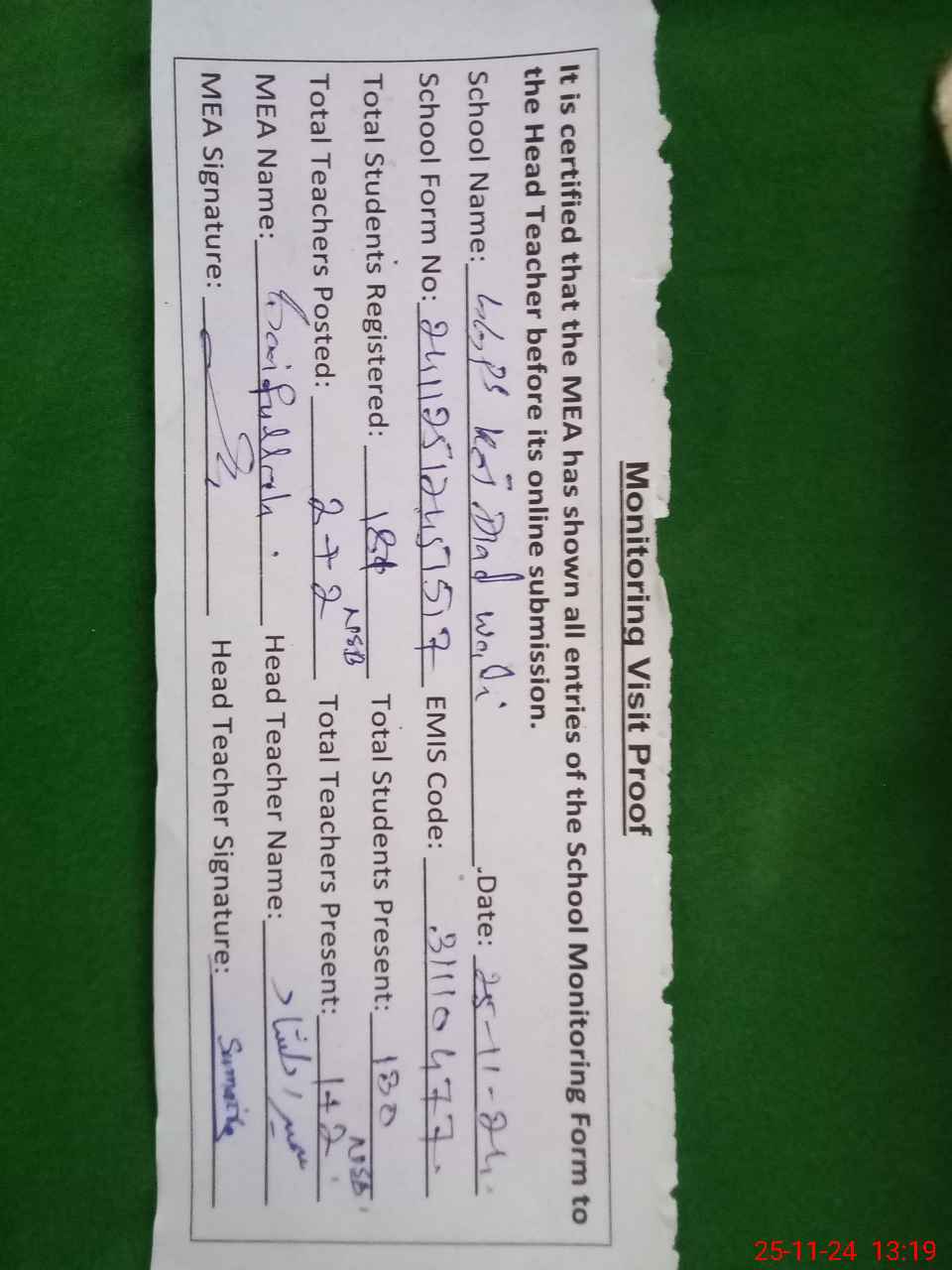 | Attendance Register | Head Teacher | MEA with School | Visit Proof |
