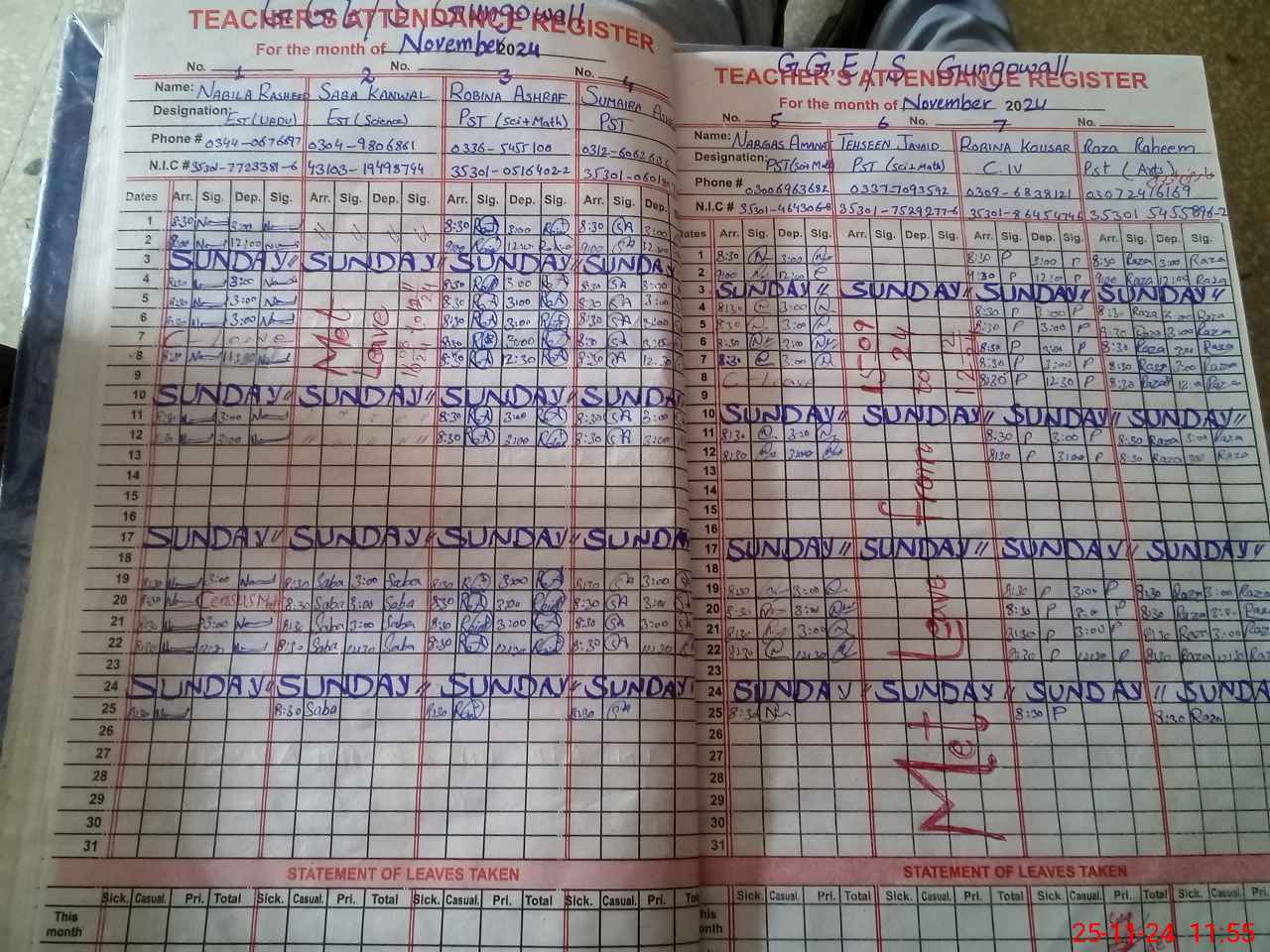 | CNIC | Full Name | Designation | R/C | Absence During Last Calender Month |