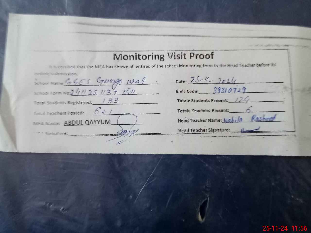 | Attendance Register | Head Teacher | MEA with School | Visit Proof |