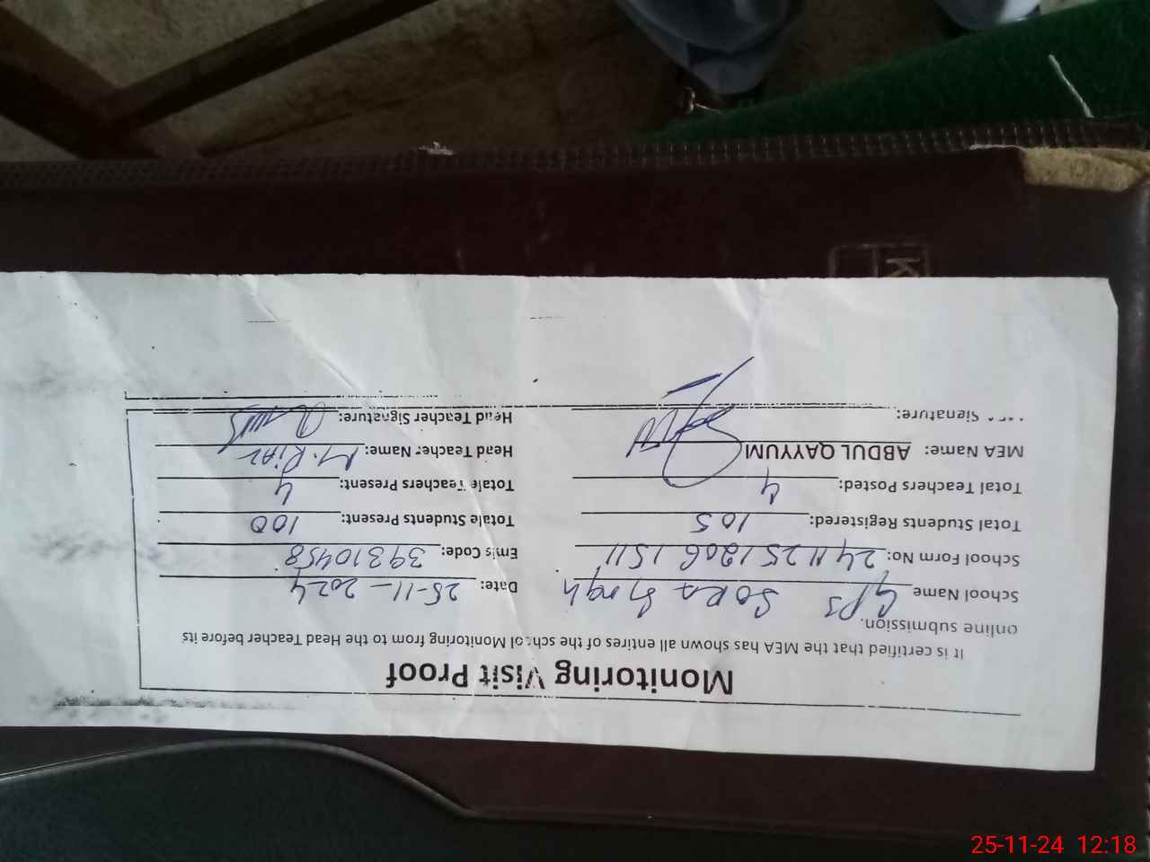 | Attendance Register | Head Teacher | MEA with School | Visit Proof |