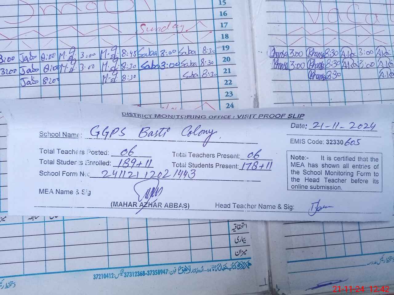| Attendance Register | Head Teacher | MEA with School | Visit Proof |