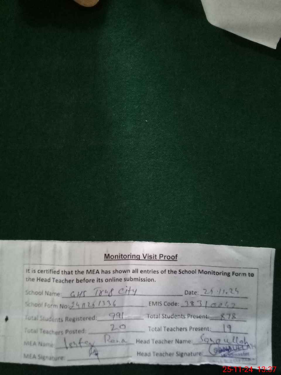 | Attendance Register | Head Teacher | MEA with School | Visit Proof |