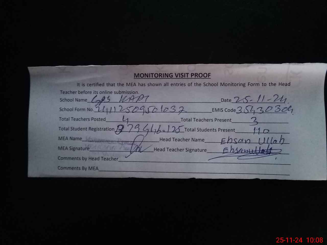 | Attendance Register | Head Teacher | MEA with School | Visit Proof |