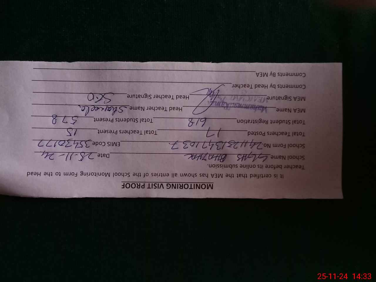 | Attendance Register | Head Teacher | MEA with School | Visit Proof |