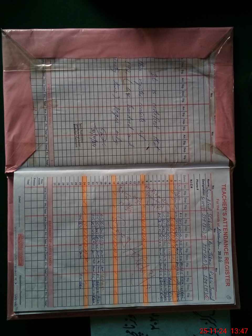 | CNIC | Full Name | Designation | R/C | Absence During Last Calender Month |