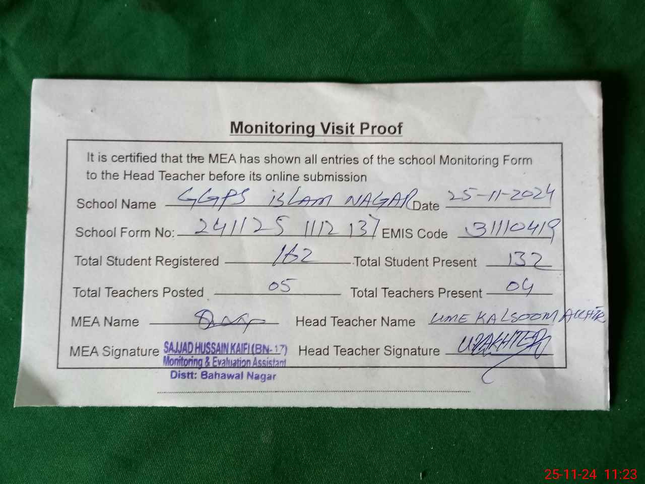 | Attendance Register | Head Teacher | MEA with School | Visit Proof |