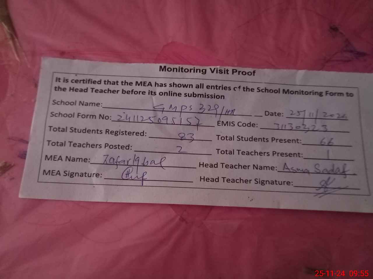 | Attendance Register | Head Teacher | MEA with School | Visit Proof |