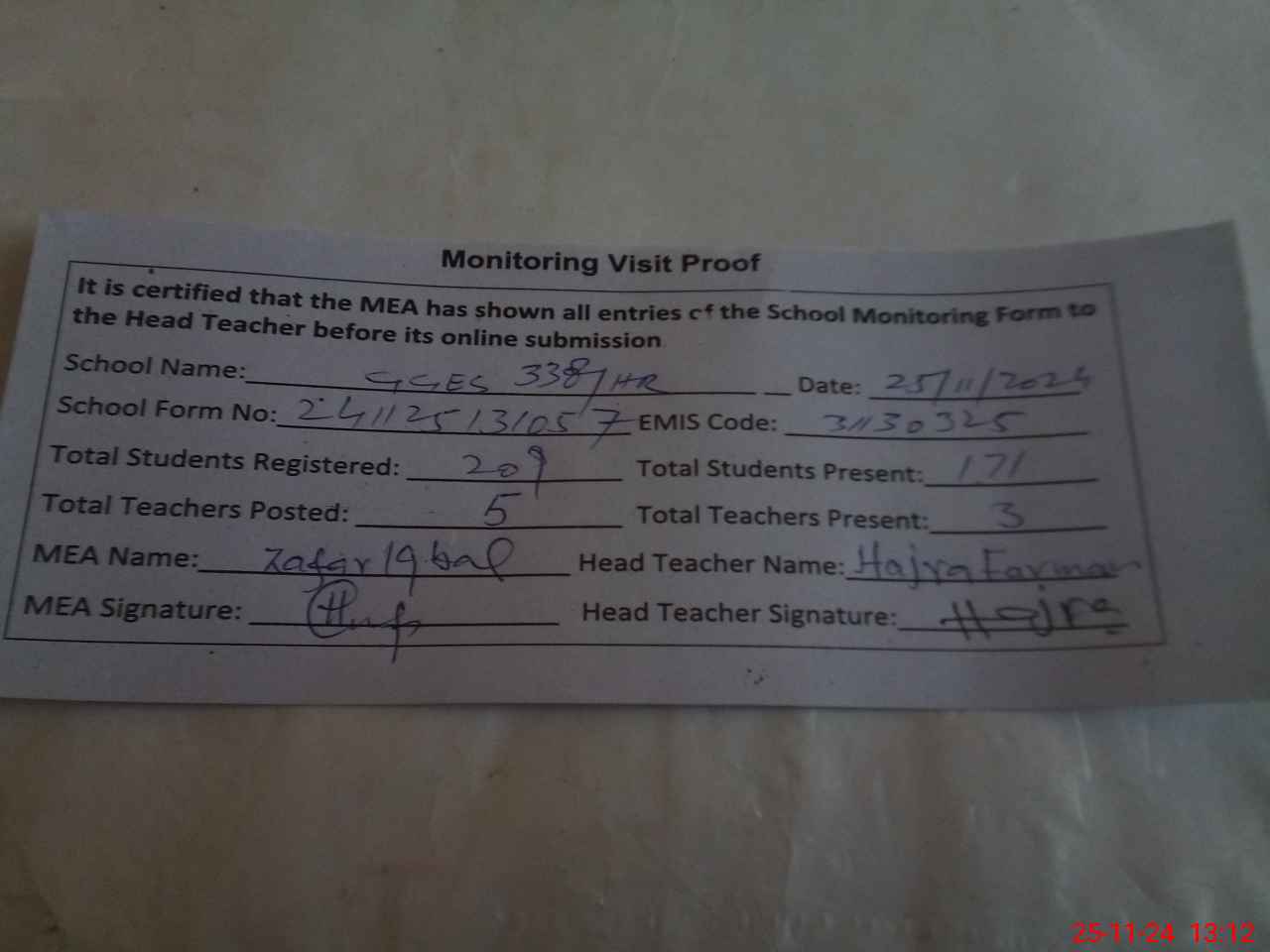 | Attendance Register | Head Teacher | MEA with School | Visit Proof |