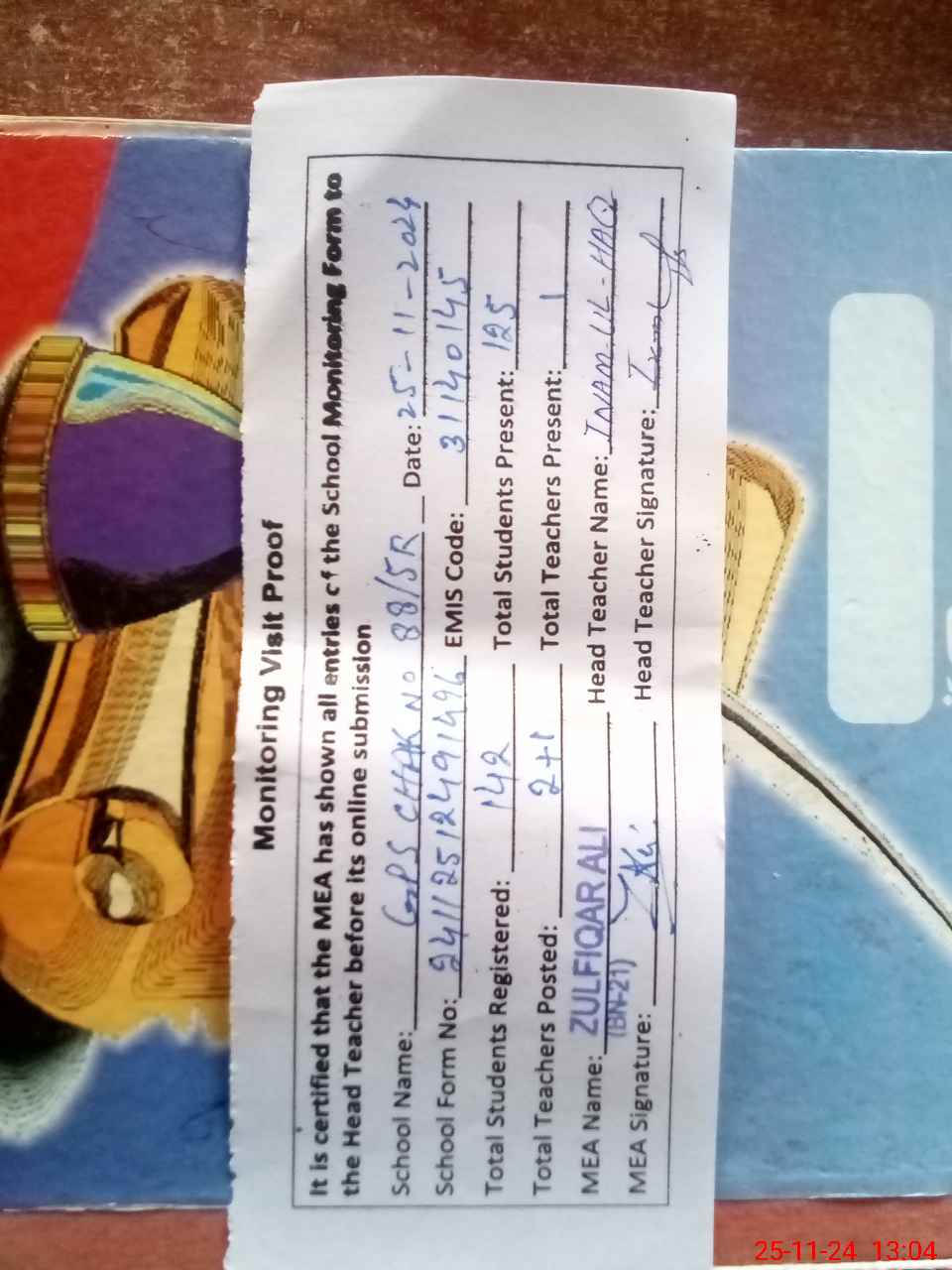 | Attendance Register | Head Teacher | MEA with School | Visit Proof |