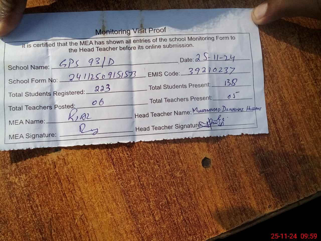 | Attendance Register | Head Teacher | MEA with School | Visit Proof |