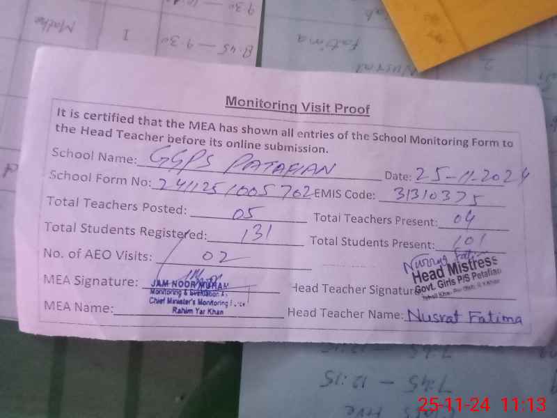 | Monitoring Date: 25-11-2024 | Start Time: 25-11-2024 10:05 AM | End Time: 25-11-2024 11:13 AM | Name of MEA: No**** Mu**** | |