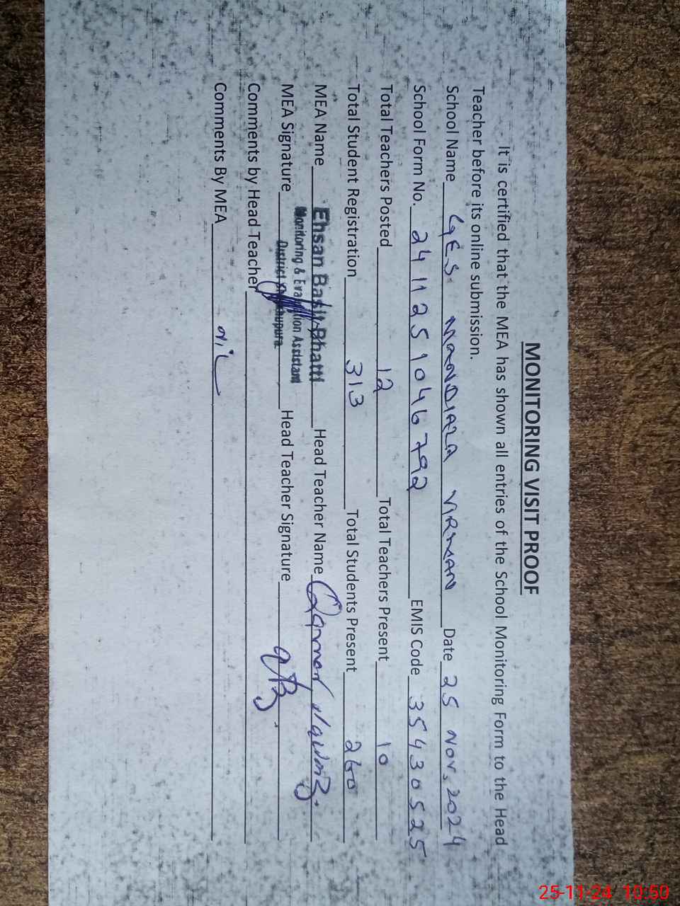 | Attendance Register | Head Teacher | MEA with School | Visit Proof |