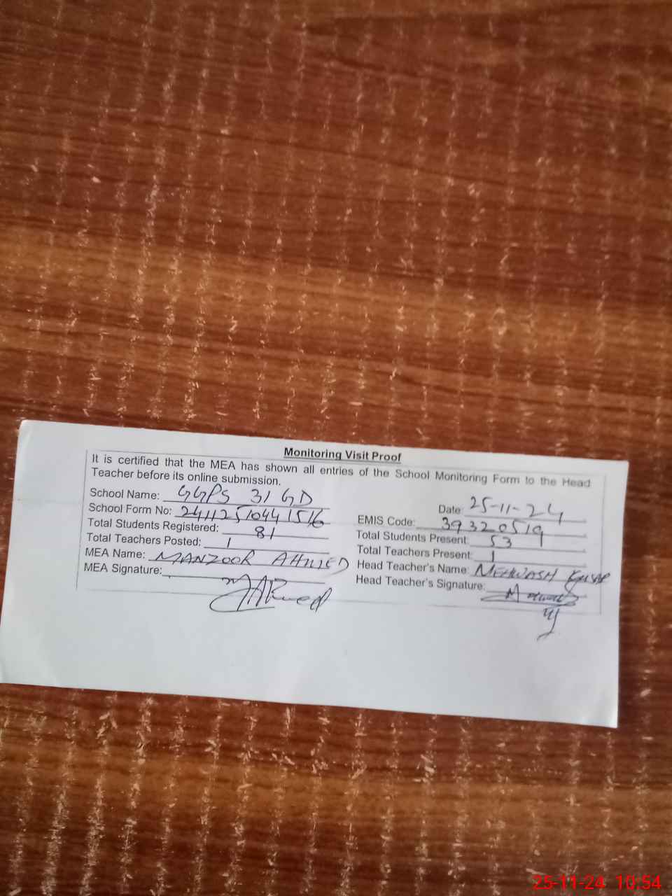 | Attendance Register | Head Teacher | MEA with School | Visit Proof |