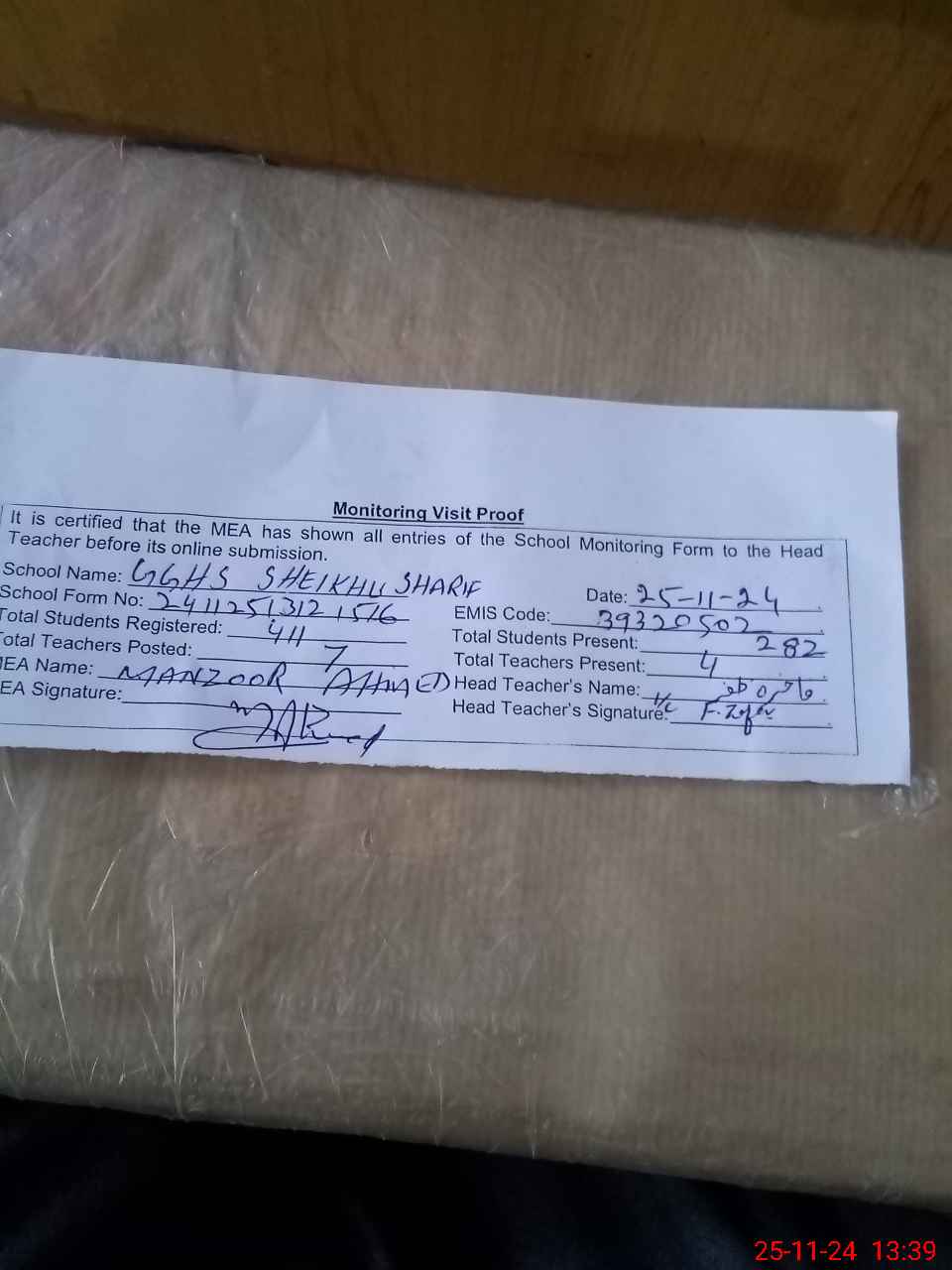 | Monitoring Date: 25-11-2024 | Start Time: 25-11-2024 01:12 PM | End Time: 25-11-2024 01:39 PM | Name of MEA: MA**** AH**** | |