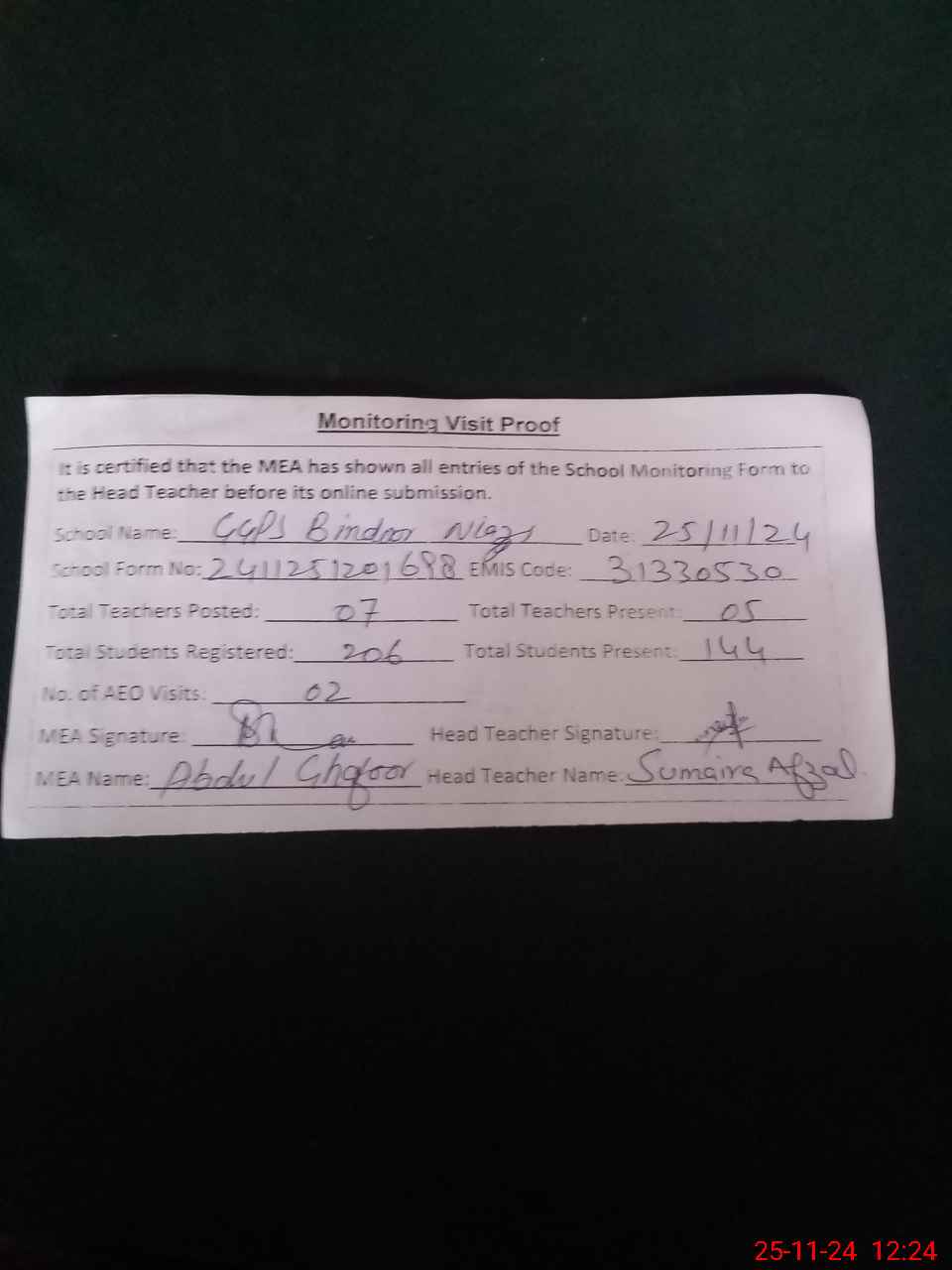 | Attendance Register | Head Teacher | MEA with School | Visit Proof |