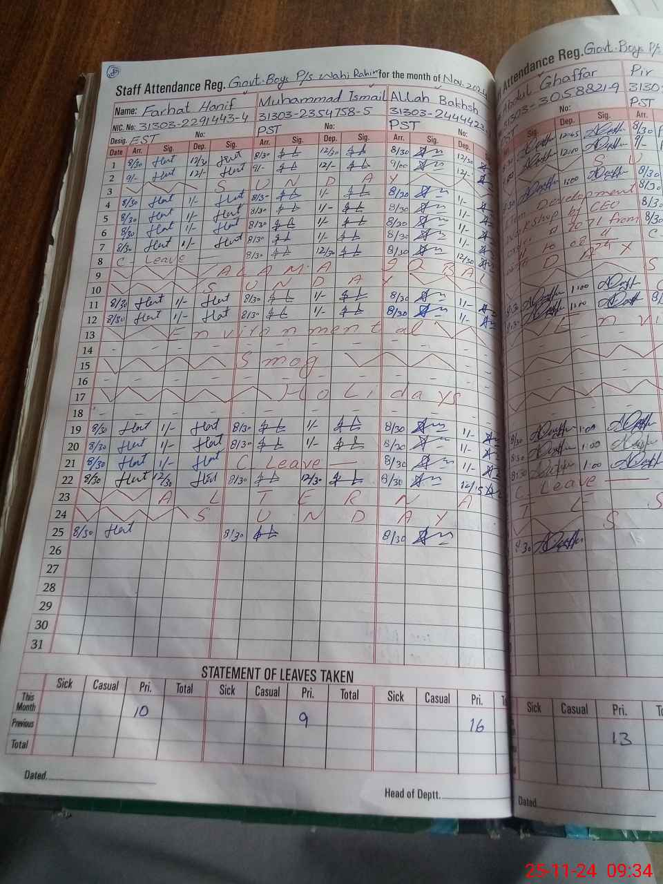 | CNIC | Full Name | Designation | R/C | Absence during last cal. month |