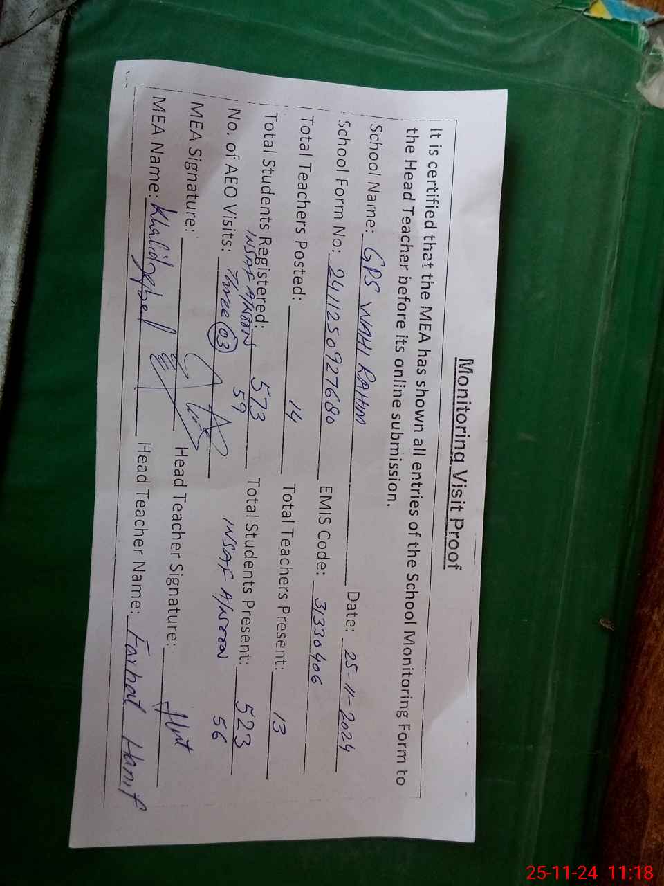 | Remarks (Use Separate Page if Required): Class verification is not updated on mea tab as per sis and school has insaf afternoon classes with students strength 59 Six classes are sitting under shed | |||||