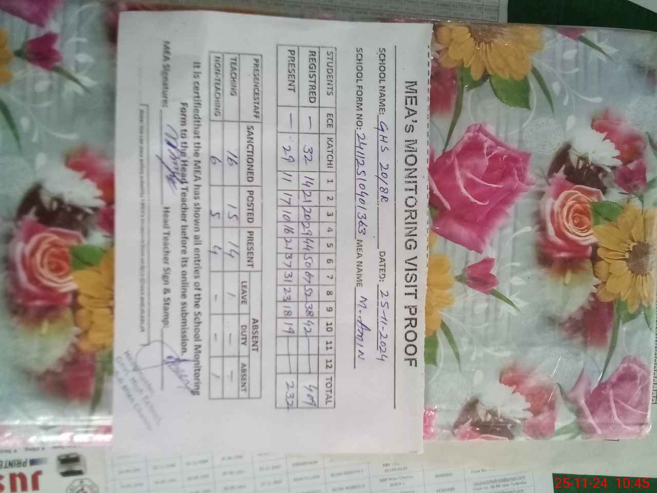 | Attendance Register | Head Teacher | MEA with School | Visit Proof |